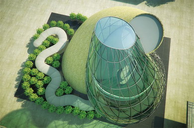 建筑的碟形外觀立面簡潔,從設計體型上減少了空調(diào)的負荷與能耗,從而降低了整個建筑的能耗。其主體部分采用懸挑結構,實現(xiàn)外遮陽效果,下層圓弧表面形成自遮陽體系,在高溫季節(jié)可避免陽光直射,同時為玻璃屋頂 的地下空間進行自然采光。