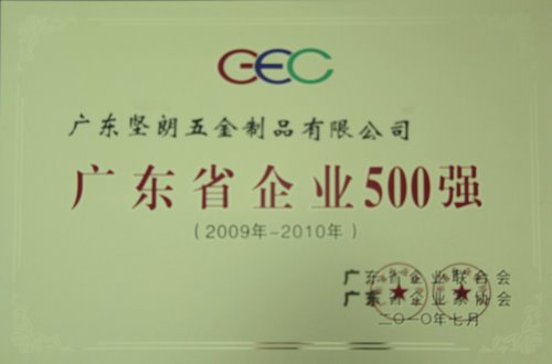 2010 年7月15日廣東省企業聯合會、廣東省企業家聯合會在廣州珠江賓館召開表彰會議,對2010年廣東省企業500強頒發了榮譽證書、牌匾。其中廣東堅朗以雄厚的實力作為堅實后盾,獲得廣東企業500強榮譽稱號,名列入選廣東企業500強的東莞企業第三名。