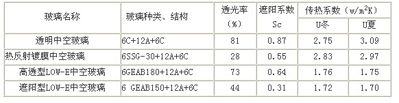 說明:6C表示6mm透明玻璃,SSG-30 、GEAB180、GEAB150分別是格蘭特公司熱反射玻璃和Low-E玻璃型號。傳熱系數是美國ASHRAE標準條件下的數值。