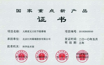 “大跨度無立柱幕墻”是江河幕墻第三次成功獲得國家科技部委自主創(chuàng)新產(chǎn)品認定,充分體現(xiàn)了江河幕墻在行業(yè)領(lǐng)域中的強大科研實力和自主創(chuàng)新能力,也很好的印證了江河幕墻自主研發(fā)的新產(chǎn)品符合國家節(jié)能減排的產(chǎn)業(yè)政策。