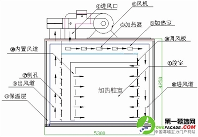 圖中箭頭方向表示風(fēng)的流向,風(fēng)機(jī)將冷風(fēng)吹到加熱區(qū),通過加熱形成熱風(fēng)在爐內(nèi)循環(huán),以4400mm×3700mm×3300mm的爐內(nèi)尺寸為例,要求內(nèi)部的風(fēng)量達(dá)到40000m3/h以上,循環(huán)速度要求在1.5m/s左右,這同樣為了能夠使內(nèi)部空氣流通的均勻,建議采用多臺風(fēng)機(jī)多個進(jìn)風(fēng)口的辦法提高空其在爐內(nèi)部的均勻性。這里還要強(qiáng)調(diào)的是風(fēng)道、風(fēng)機(jī)的保溫也是至關(guān)重要。